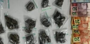 Um dos suspeitos foi alcançado e, durante a busca pessoal, os policiais encontraram em sua posse 23 trouxas de substância análoga à maconha, um celular, R$ 240 em espécie, além de cédulas estrangeiras, uma de 10 bolivianos e outra de 2 pesos argentinos.